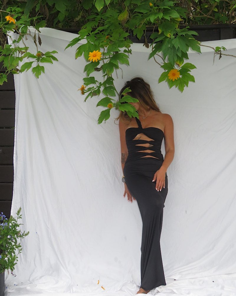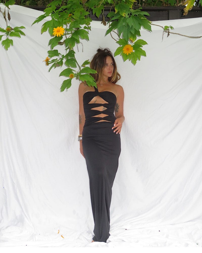 LANA; PULL ON ONE SHOULDER FLOOR LENGTH DRESS, CUT FROM OUR COMPRESSION LYCRA FABRIC & FULLY LINED FEATURING SOPHISTICATED CUT OUTS, BRAIDED SHOULDER STRAP. A SOPHISTICATED PIECE FOR ANY OCCASION, OUR FABRIC IS FOUR WAY STRECH, DESIGNED FOR COMFORT